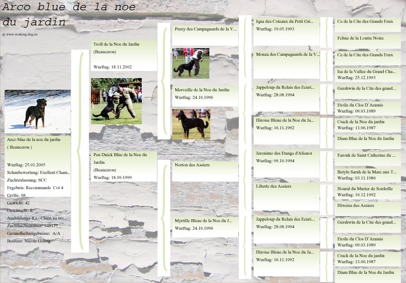 Unser Beauceronrüde Arco ist am 25.01.2005 geboren, er ist unser aller Stolz. Er stammt aus der Zucht von Michèle Ponce-Moreau. http://noe-du-jardin.chiens-de-france.com/
