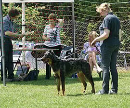 Nun machte ich mich langsam auf den Weg zur Beurteilung der Schönheit meiner Hunde. Ich durfte Topaz seiner Züchterin Michele Moreau abgeben zum Ausstellen, der Richter war sehr zufrieden mit Topaz, er sei noch nicht ganz fertig aber im grossen und ganzen sehr schön, somit haben wir ein Excellent bekommen womit ich mehr als zufrieden bin. Topaz ist mit seinen 21 Monaten noch jung und muss sich entwickeln. Mit der Cotation 3 haben wir einen tollen einstieg erzielt. Arco hatte bereits die Cotation 4 somit konnte er nicht mehr erreichen