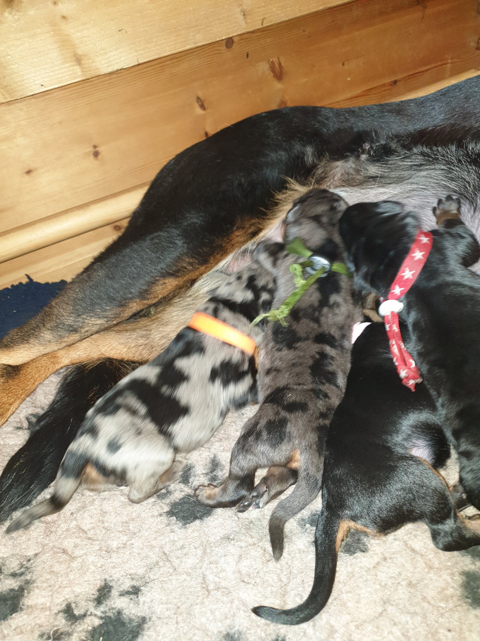 Am 29.05.2022 sind nun die 5 kleinen zur Welt gekommen, es sind 2 Rüden noir et feu 1 Rüde Harlekin 1 Hündin noir et feu und 1 Hündin Harlekin. Es ist ein sehr properer Wurf mit Geburtsgewicht von 550-680g. Wir sind schon sehr gespannt wie sie sich entwickeln.
